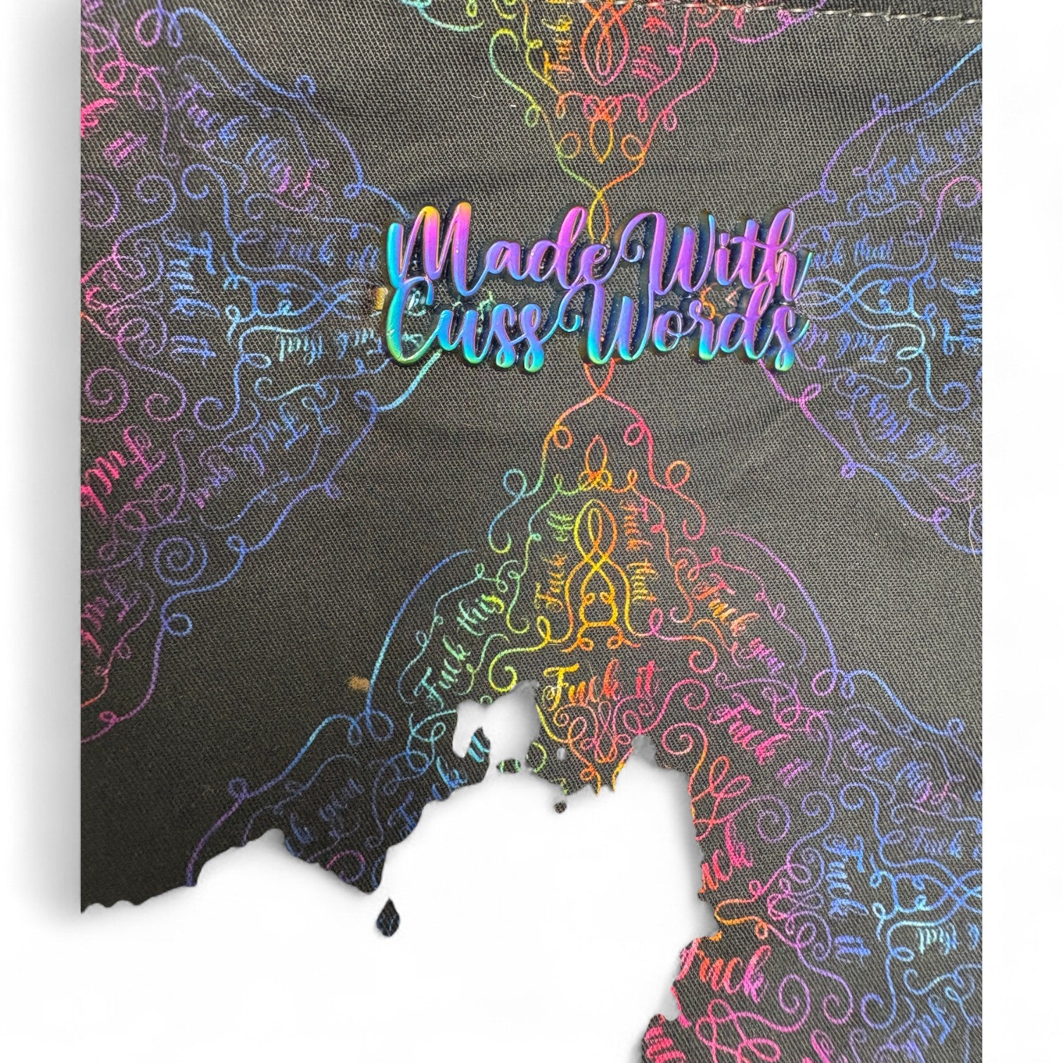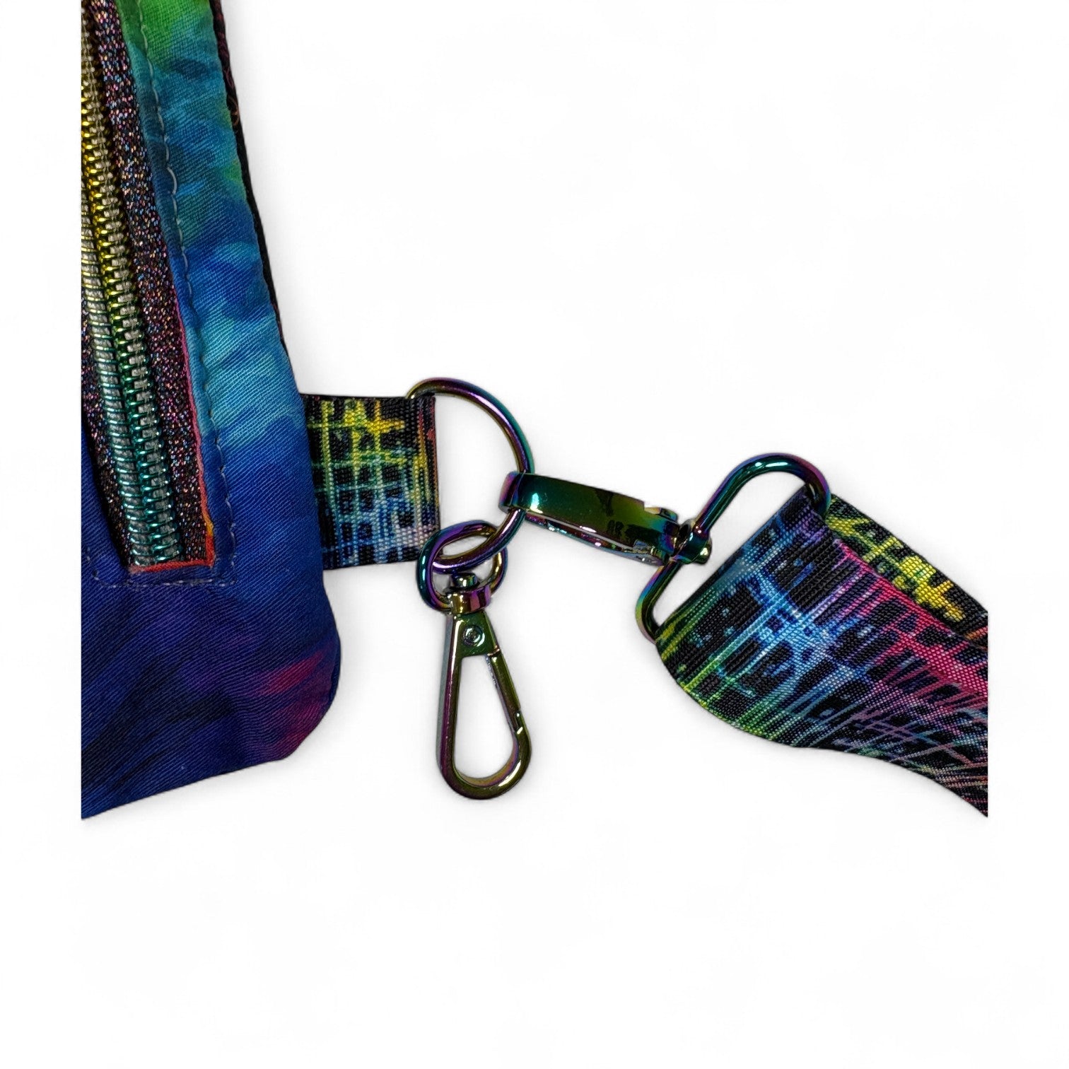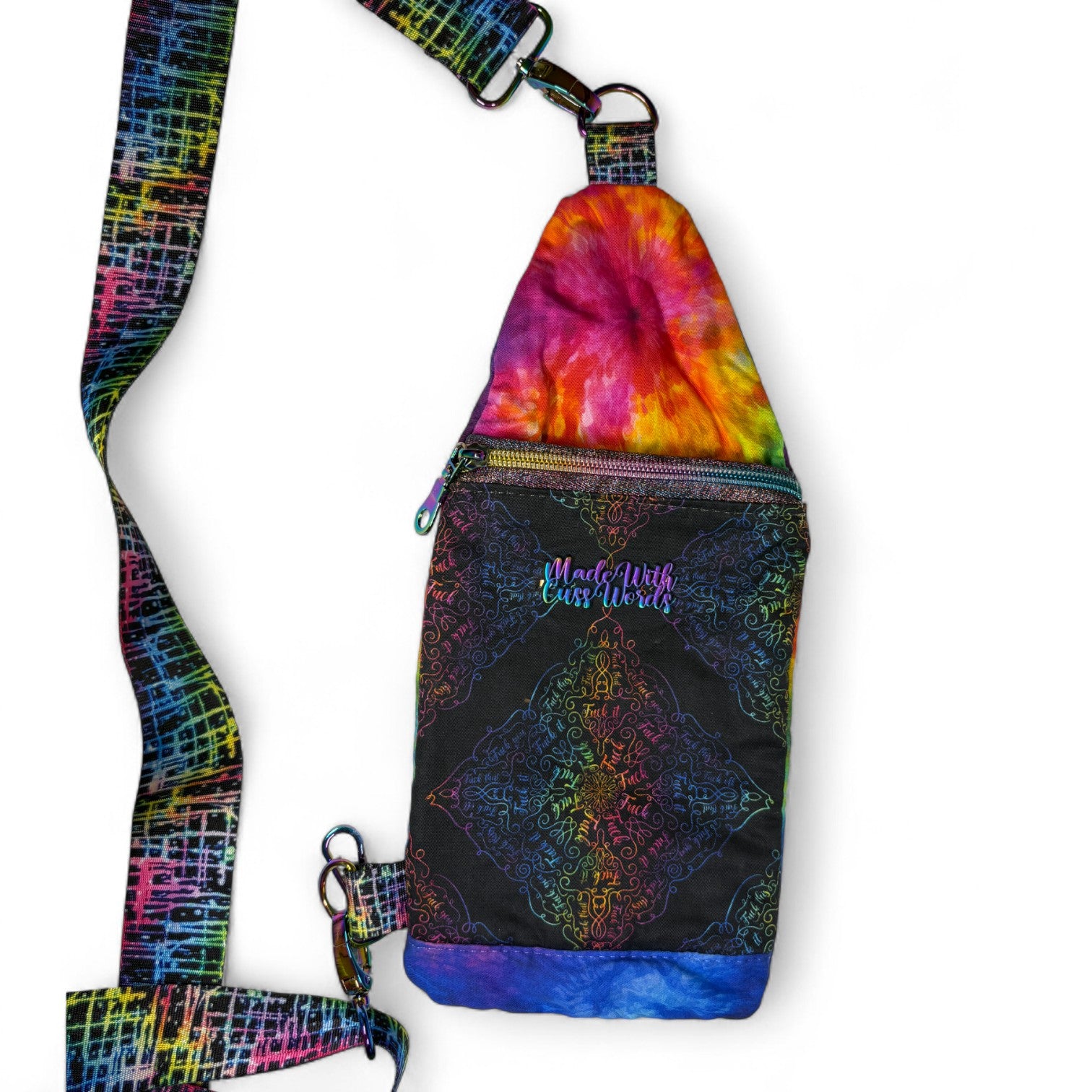 This bag is made with faux leather. This bag has ALOT of adult words on it. It comes with an adjustable strap.