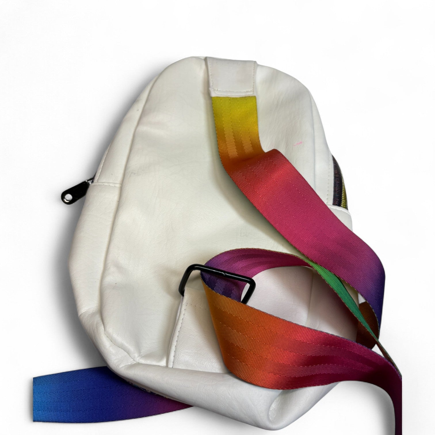 This bag is made with faux leather. It has an adjustable strap. There is a small mark on the bag that may not come out.