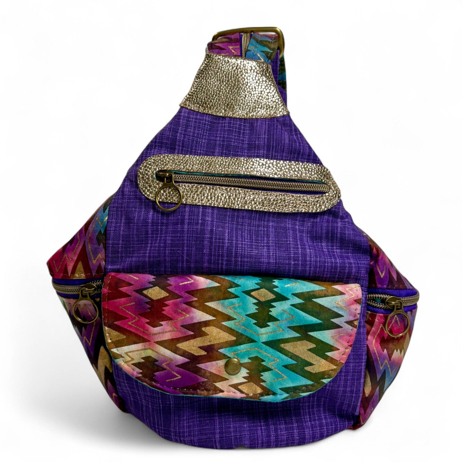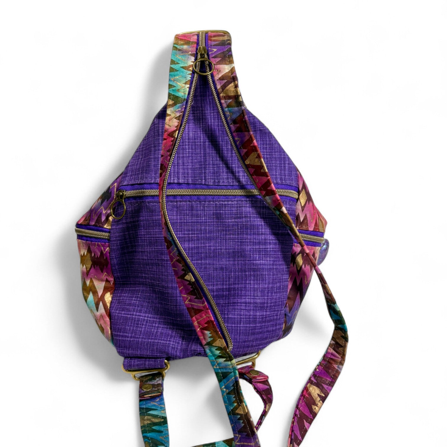 This bag is made with faux leather. It has a convertible sling/backpack strap.