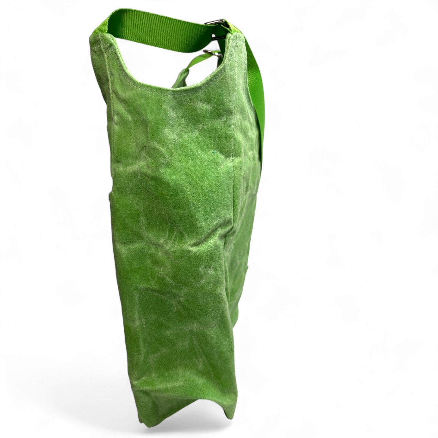 This bag is made with hand waxed canvas. It has a convertible backpack/crossbody strap.