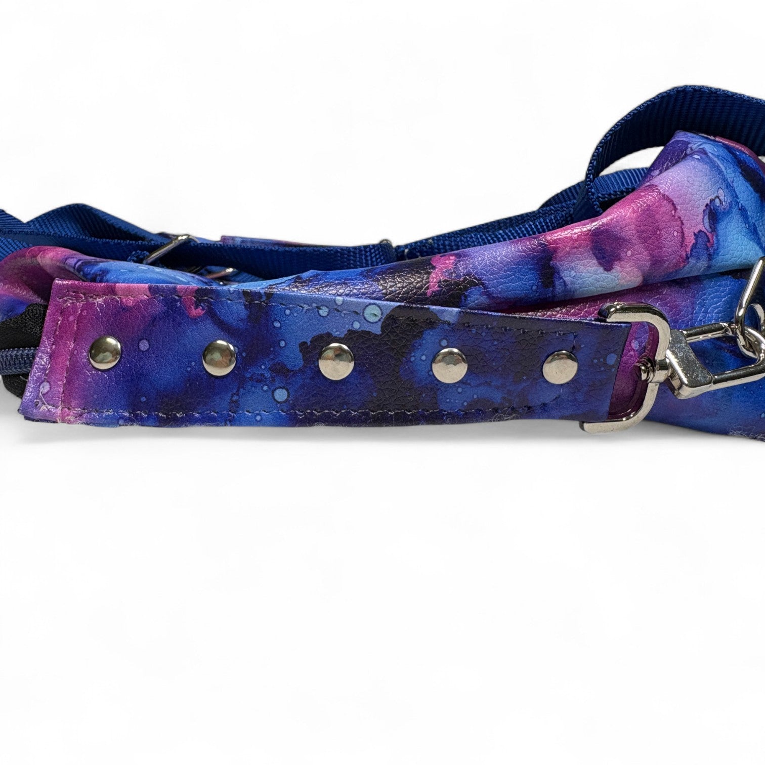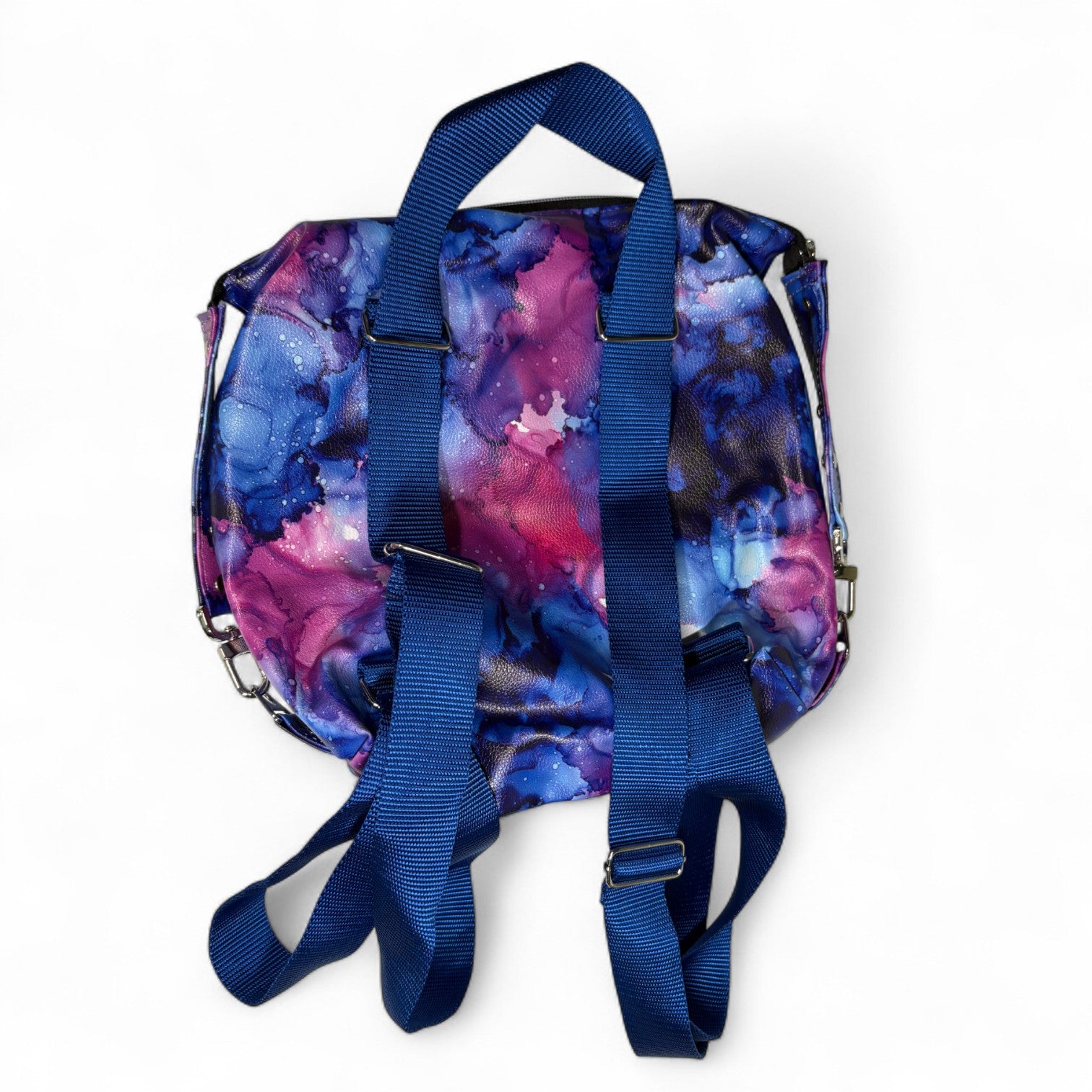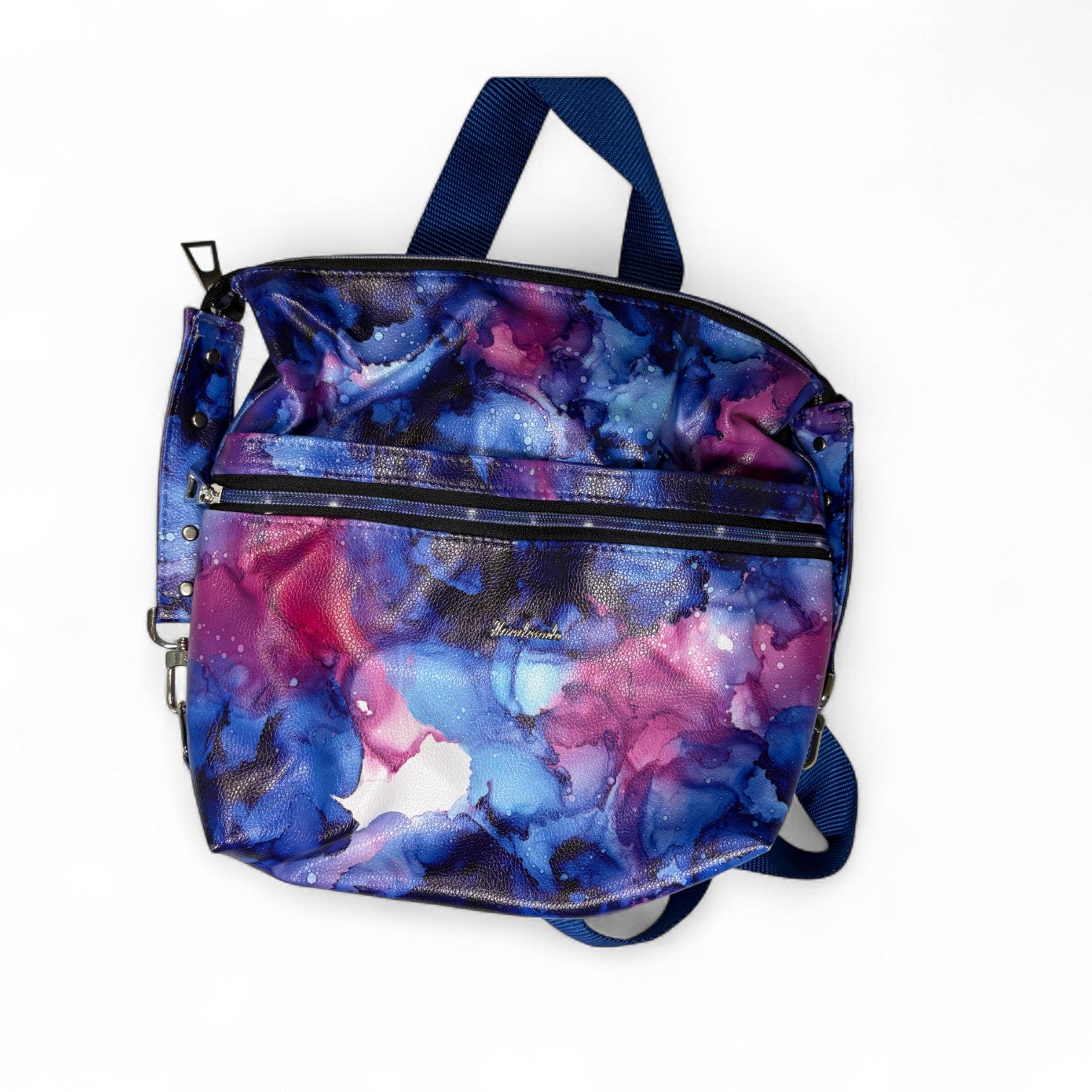 This bag is made with faux leather. It has 2 adjustable straps. This bag is heavy and large and will require additional shipping.