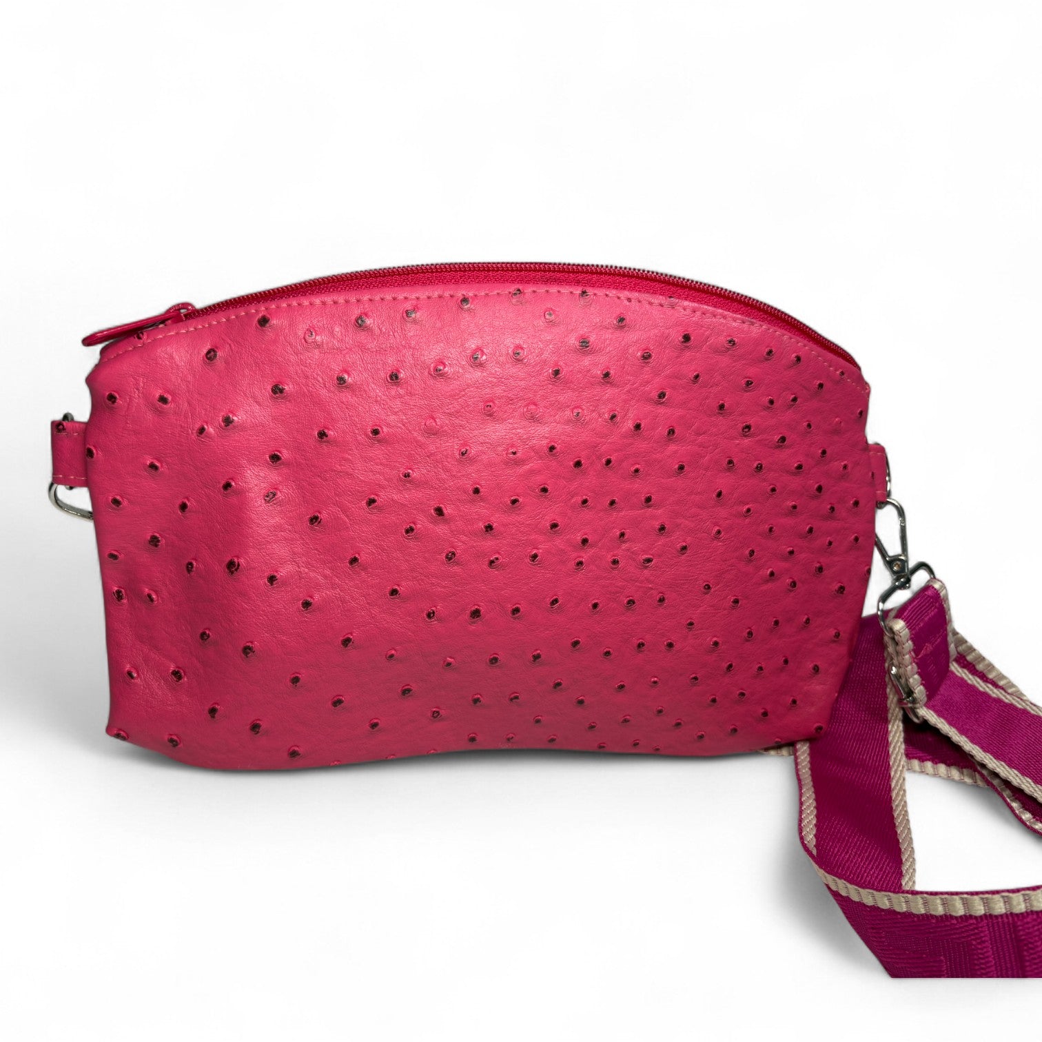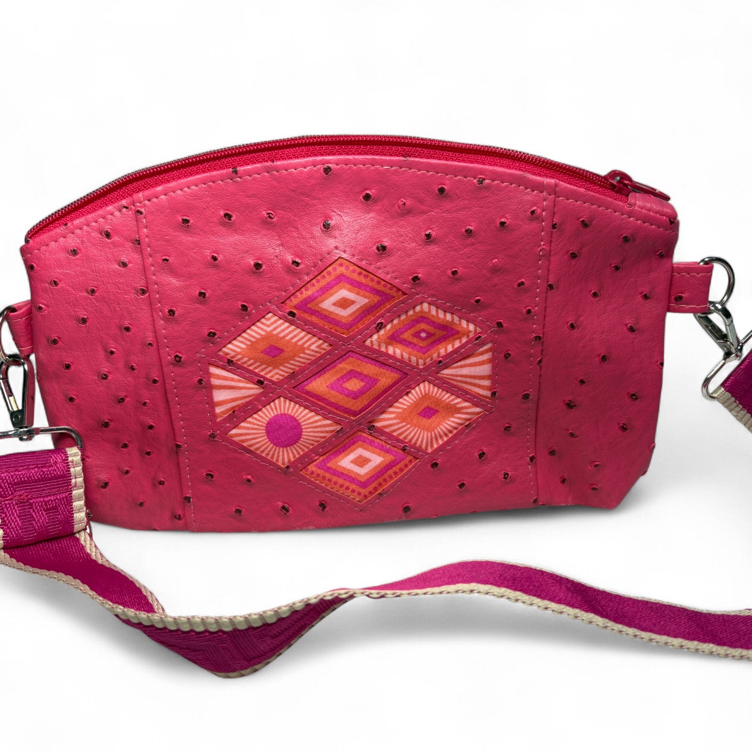 This bag is made with faux leather. It has an adjustable strap.