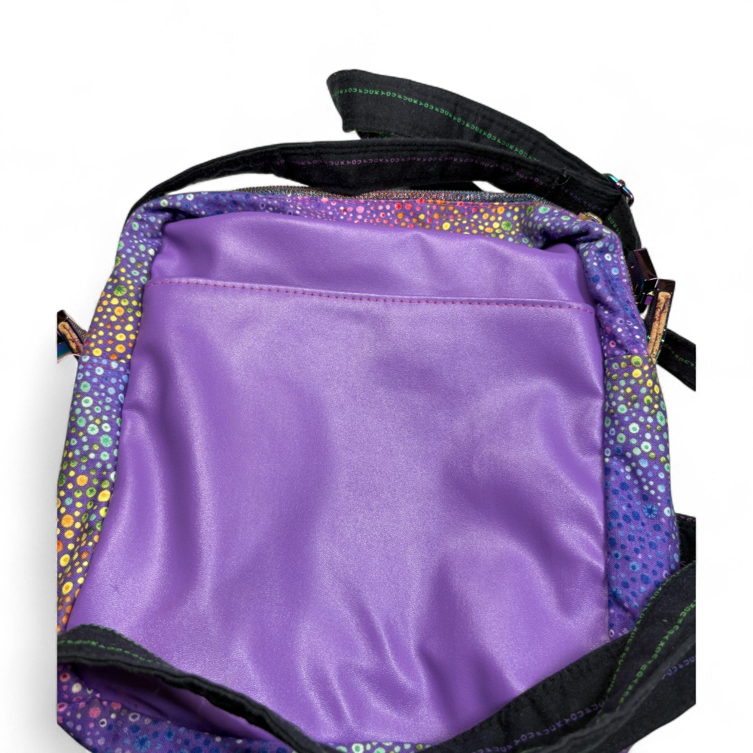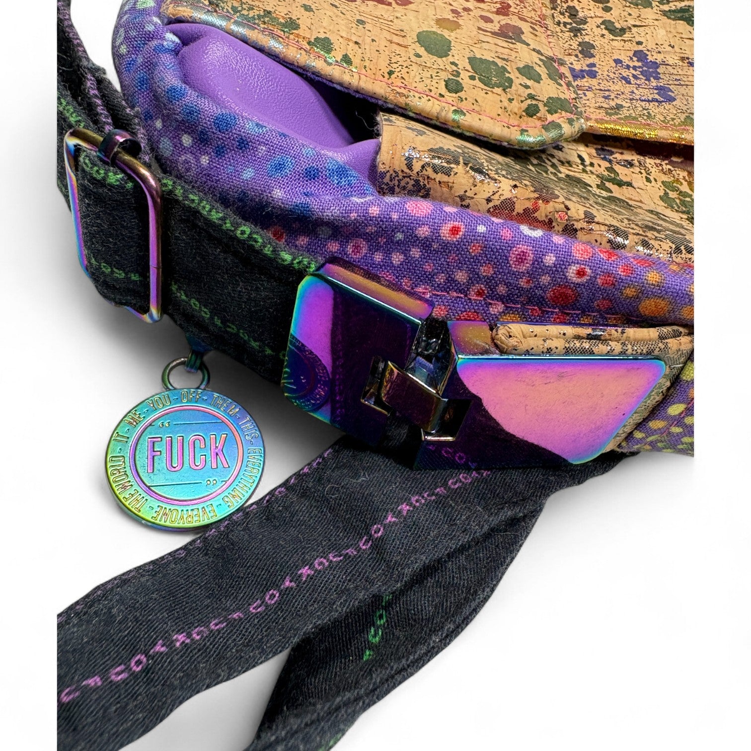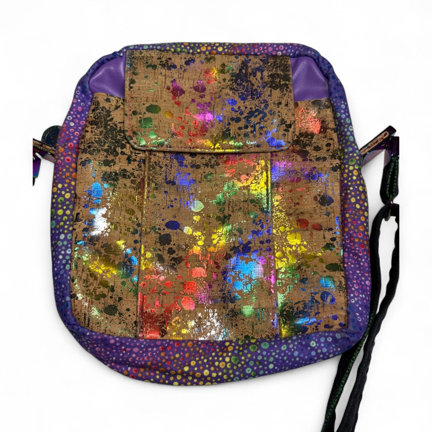 This bag is made with faux leather and cork. It has an adjustable strap.