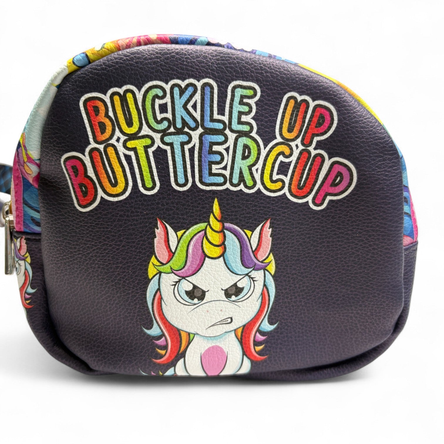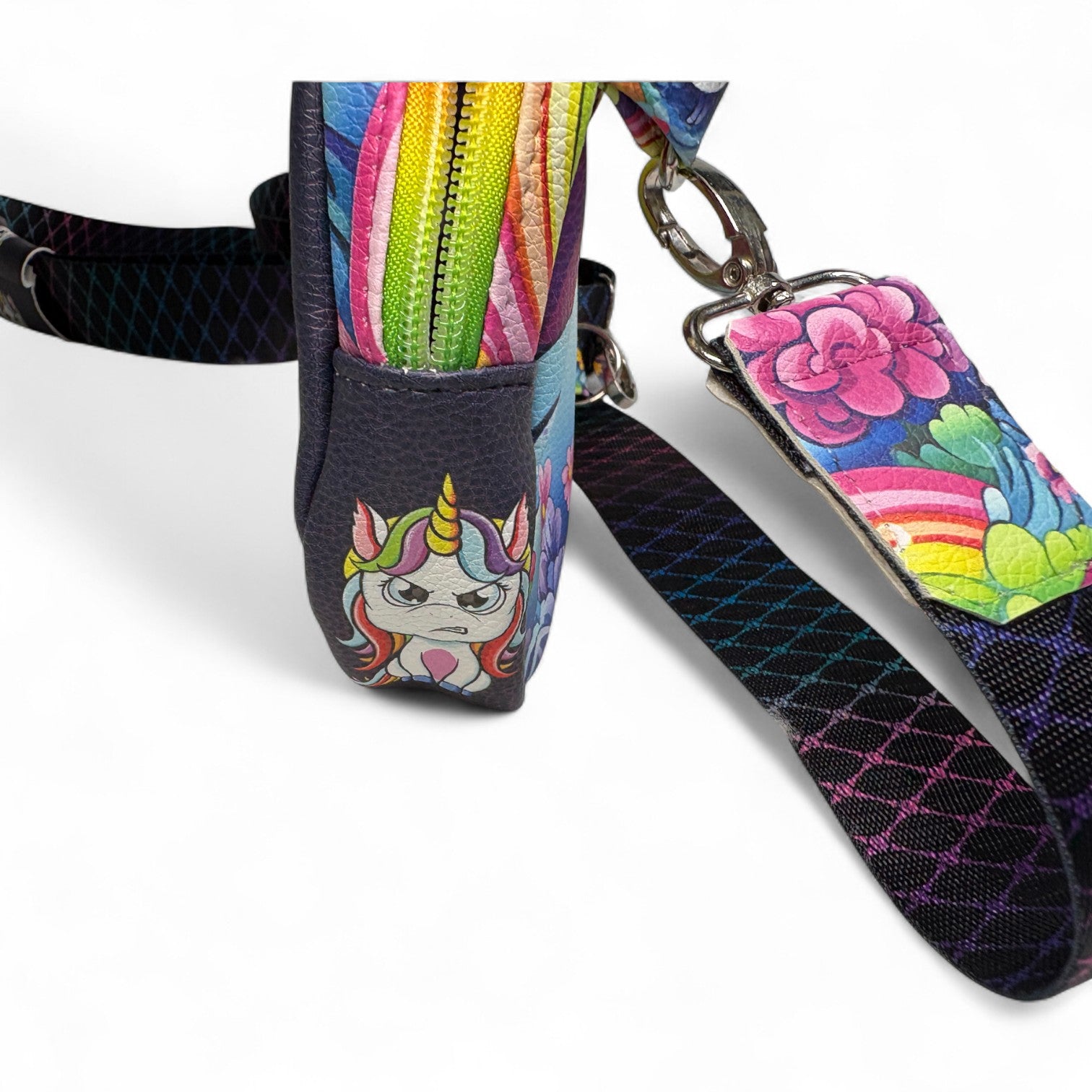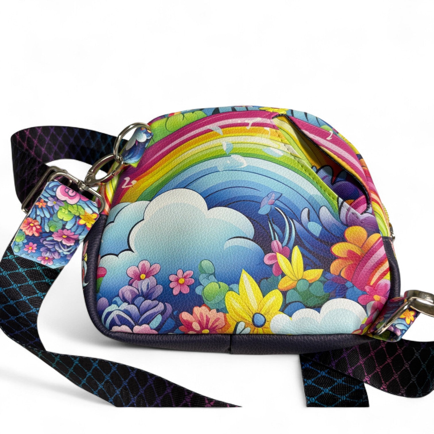 This bag is made with faux leather. It has an adjustable strap.